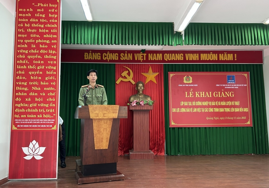Thực hiện Chương trình đào tạo, bồi dưỡng và huấn luyện của Công an tỉnh Quảng Ngãi năm 2025; đồng thời căn cứ nội dung Thỏa thuận số 100A/ANDK-CAT ngày 01/5/2025 giữa Công an tỉnh Quảng Ngãi và Công ty Cổ phần Dịch vụ Bảo vệ An ninh Dầu khí Việt Nam (ANDK) về phối hợp đảm bảo an ninh, trật tự tại Nhà máy Lọc dầu Dung Quất, ngày 03/11/2025, tại Hội trường Trung đội Cảnh sát bảo vệ Mục tiêu Nhà máy Lọc dầu Dung Quất (thôn Phước Hòa, xã Vạn Tường, tỉnh Quảng Ngãi), Công an tỉnh Quảng Ngãi đã long trọng tổ chức Lễ khai giảng lớp đào tạo, bồi dưỡng nghiệp vụ và huấn luyện võ thuật năm 2025 cho 213 học viên là lực lượng bảo vệ đang làm việc tại các công trình quan trọng liên quan đến an ninh quốc gia trên địa bàn tỉnh.