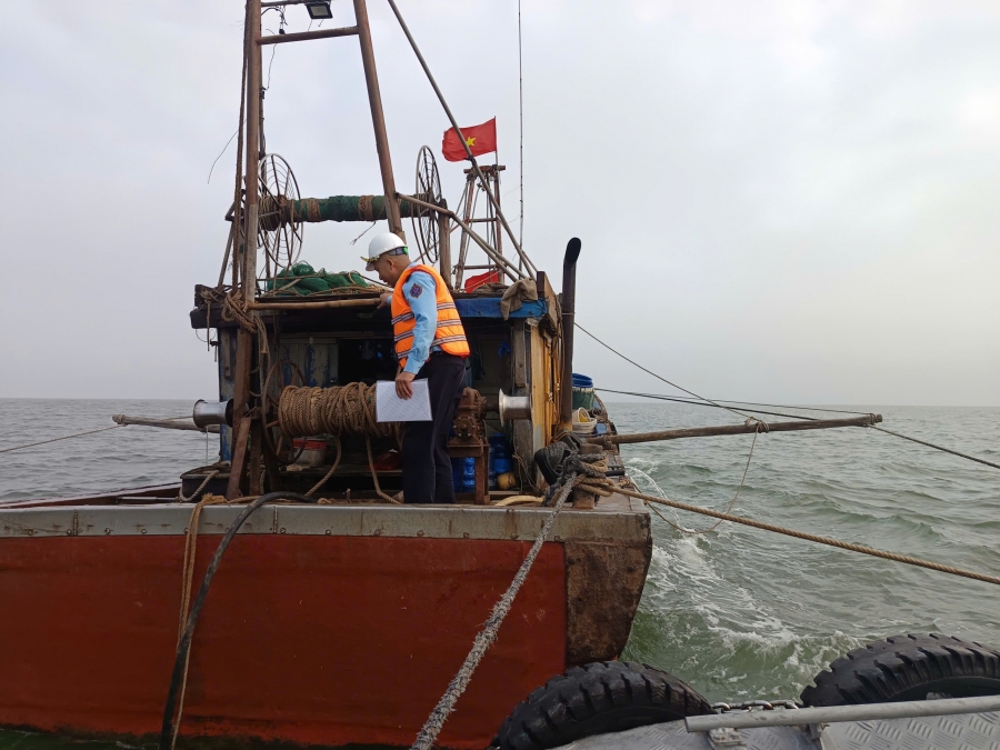 Tác phẩm: Lực lượng bảo vệ ANDK tiếp cận tàu cá ngư dân để phổ biến nội quy; chủ động phát hiện, ngăn chặn từ xa các nguy cơ ảnh hưởng đến an toàn hành lang tuyến ống trên biển, đồng thời tuyên truyền và xử lý vi phạm theo quy định.