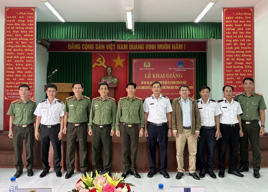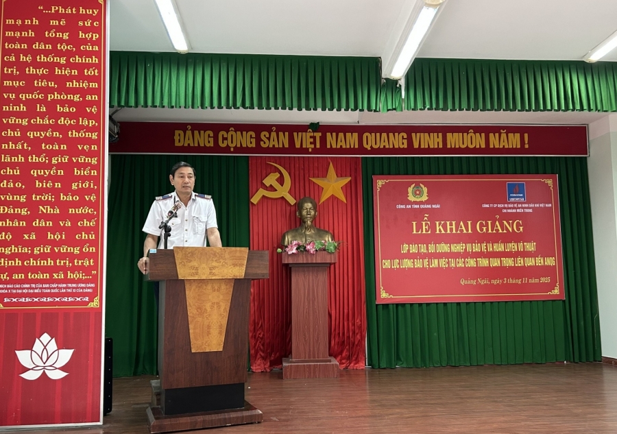 Thực hiện Chương trình đào tạo, bồi dưỡng và huấn luyện của Công an tỉnh Quảng Ngãi năm 2025; đồng thời căn cứ nội dung Thỏa thuận số 100A/ANDK-CAT ngày 01/5/2025 giữa Công an tỉnh Quảng Ngãi và Công ty Cổ phần Dịch vụ Bảo vệ An ninh Dầu khí Việt Nam (ANDK) về phối hợp đảm bảo an ninh, trật tự tại Nhà máy Lọc dầu Dung Quất, ngày 03/11/2025, tại Hội trường Trung đội Cảnh sát bảo vệ Mục tiêu Nhà máy Lọc dầu Dung Quất (thôn Phước Hòa, xã Vạn Tường, tỉnh Quảng Ngãi), Công an tỉnh Quảng Ngãi đã long trọng tổ chức Lễ khai giảng lớp đào tạo, bồi dưỡng nghiệp vụ và huấn luyện võ thuật năm 2025 cho 213 học viên là lực lượng bảo vệ đang làm việc tại các công trình quan trọng liên quan đến an ninh quốc gia trên địa bàn tỉnh.